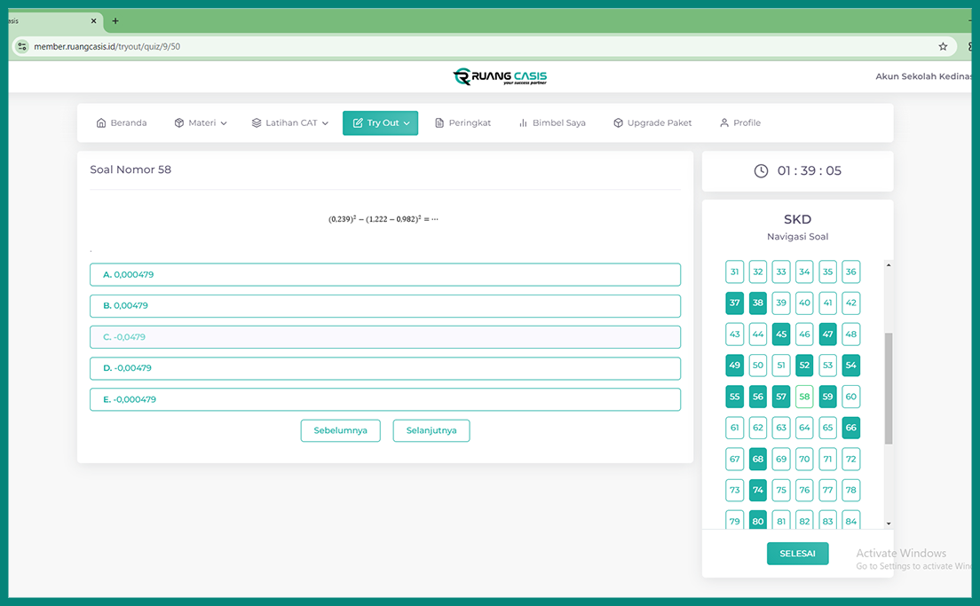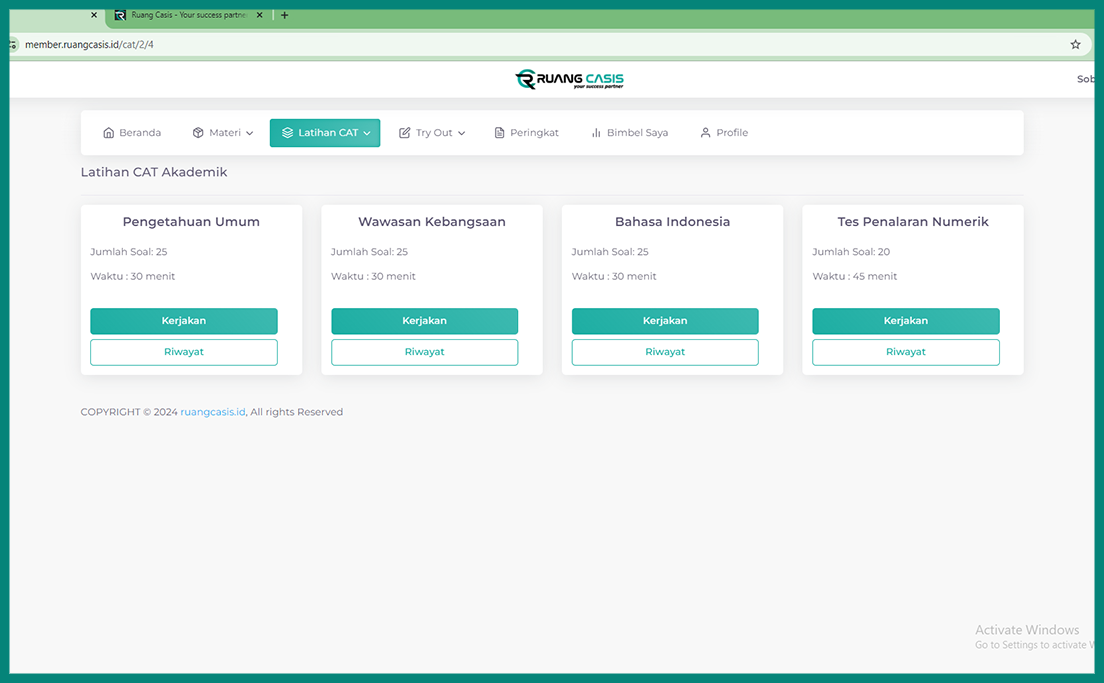 Sistem Latihan dan Try Out berbasis CAT yang telah disesuaikan dengan tes sebenarnya (real test), sehingga Sobat Casis dapat terbiasa mengerjakan soal-soal ujian sesuai dengan format dan waktu yang ditentukan.